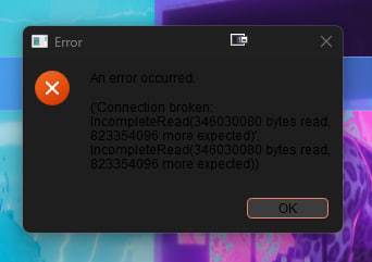 [13:12:56] ERROR: ('Connection broken: IncompleteRead(178257920 bytes read, 991126256 more expected)', IncompleteRead(178257920 bytes read, 991126256 more expected))
