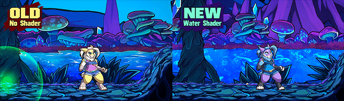 Did you notice the water in our new caves stage didn't act very... watery? Now the river on the lower half of the stage is fully animated with rippling waves and a reflective shader, casting the distant mushrooms back onto the surface! We will be adding small animated details like this to all backgrounds to make them feel more alive as we polish things up.